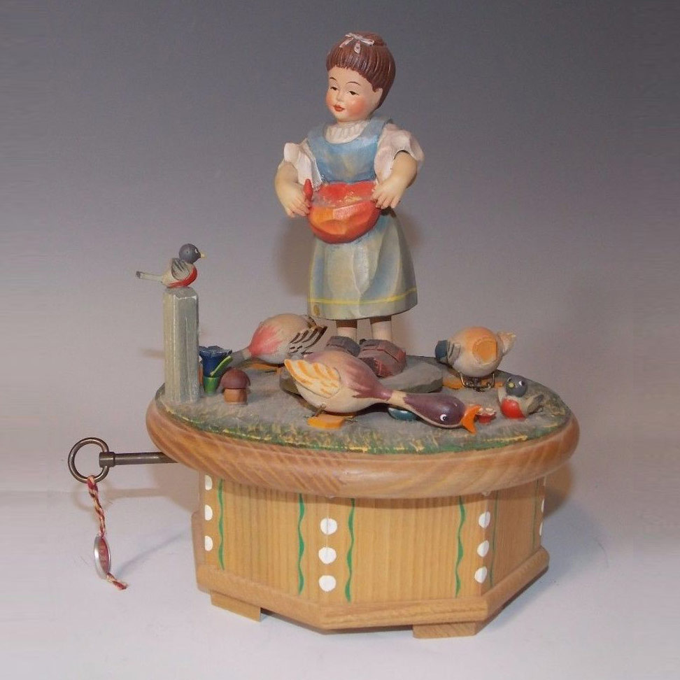 Anri “Never on a Sunday” Music Box, Thorens Swiss Movement. Farm girl feeding geese and birds. Measures approximately 8-1/4 inches tall to the top of the girl’s head, and 6-1/2 inches across at the top edge of the wood platform. The platform rotates as the music plays and the geese pecking something from the groud lifting and lowering their heads. Wood is hand carved in Italy. The movement is a Genuine Thorens Swiss work, and the original Thorens tag remains attached to the key.